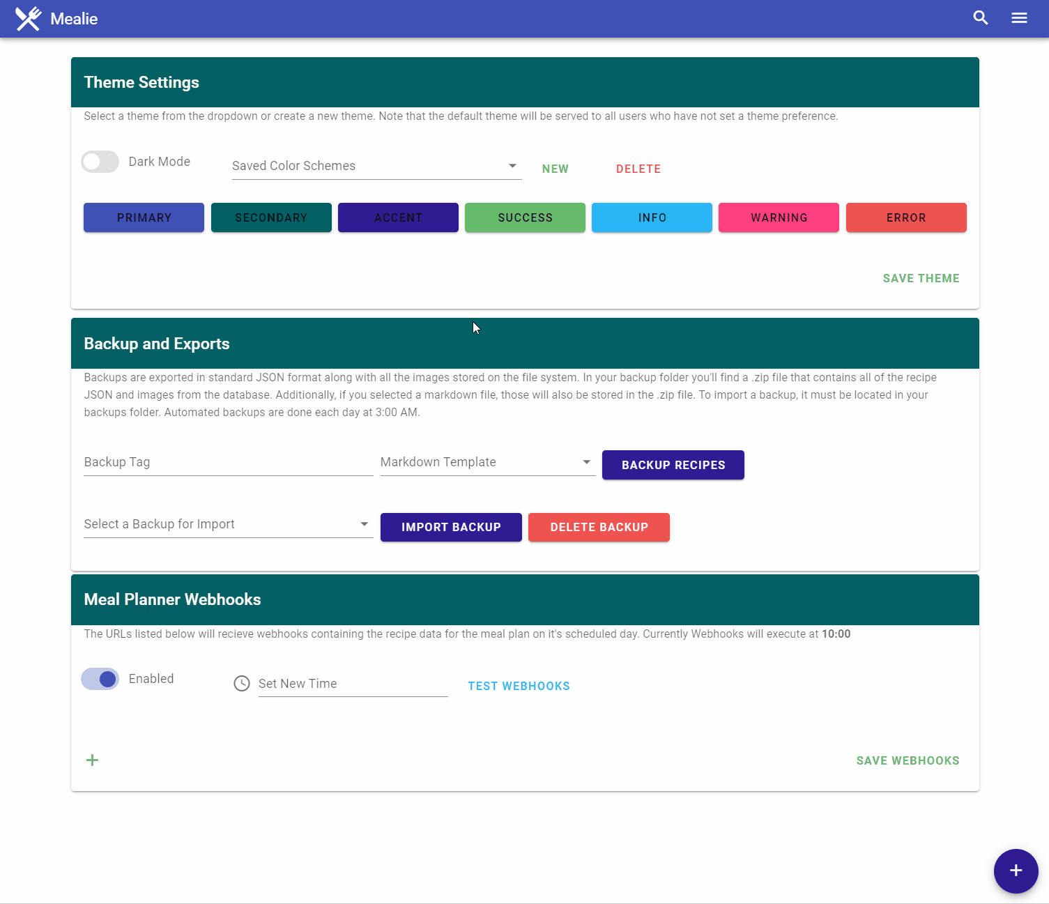 Meal planner webhooks are post requests sent from Mealie to an external endpoint. The body of the message is the Recipe JSON of the scheduled meal. If no meal is schedule, no request is sent. The webhook functionality can be enabled or disabled as well as scheduled. Note that you must "Save Webhooks" prior to any changes taking affect server side.